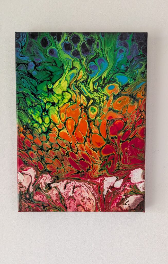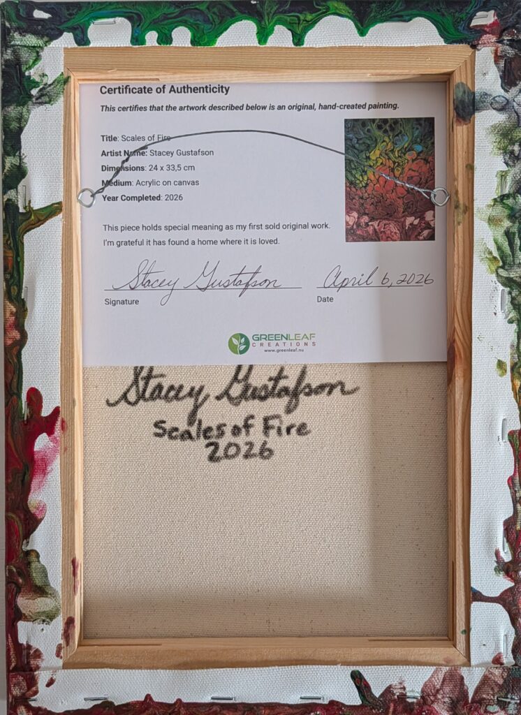 My son Ben named it Scales of Fire. I completed it at the end of September last year, and recently added three coats of varnish so it was finally ready for sale. My friend Tania loved it from the very beginning. It was by far her favorite painting I had done so far, and she always wanted to see it whenever she came over.