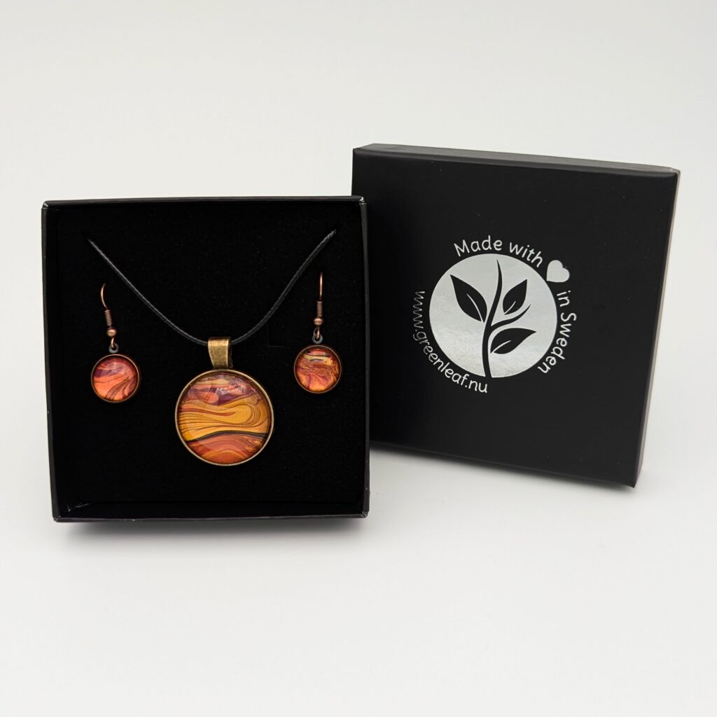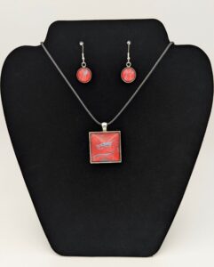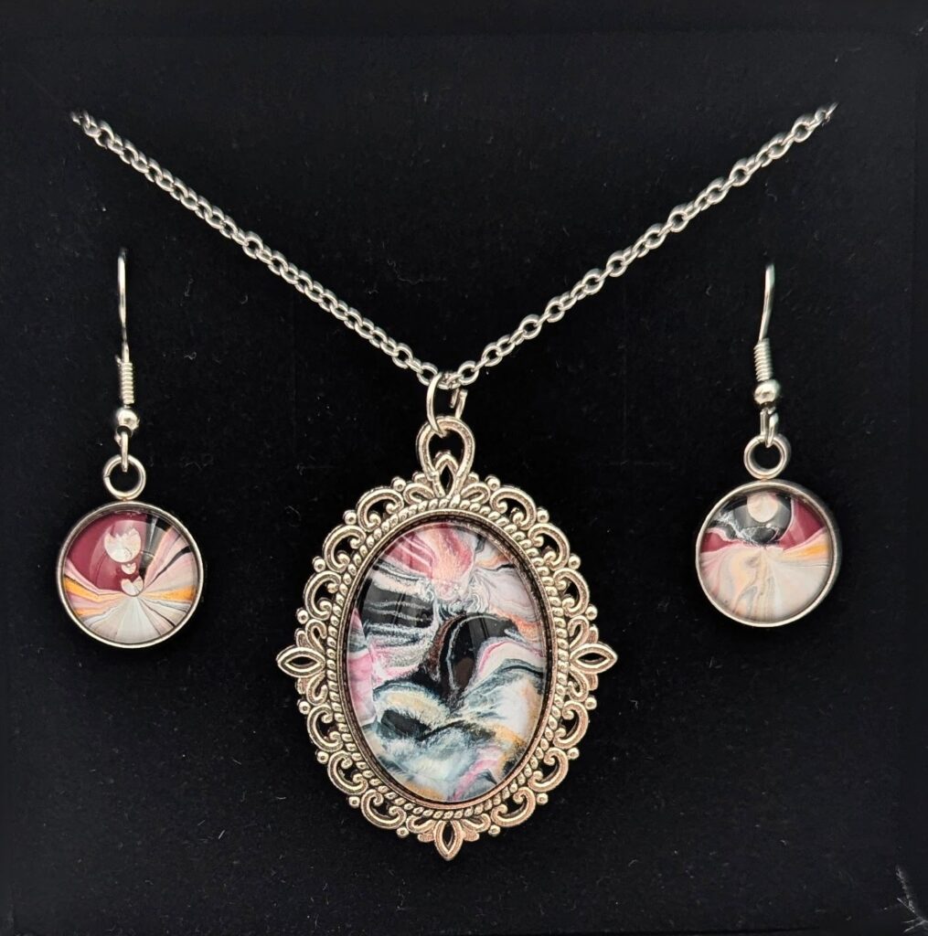 I start by making what are called paint skins: I pour out leftover paint, create designs in the wet surface, and let it dry for three to four days. Then I look for patterns that catch my eye and glue a glass cabochon on top. After another day of drying, I cut it out, set it into a pendant tray, and let it cure for one more day before polishing and photographing. So far, I've made around a hundred pieces, which I'll soon be making available for sale.