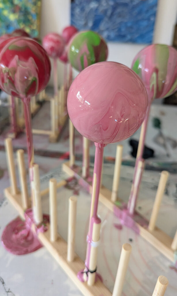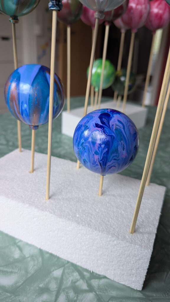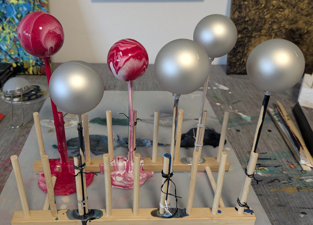 The process turned out to be as messy as it was mesmerizing. Each pour had a mind of its own, and every ornament felt like a mini adventure in color and gravity. Figuring out how to suspend them upside down so I could pour, tilt, and let the paint move naturally was its own puzzle. My first setup involved chopsticks and a wooden dish rack (very high-tech), and later I switched to skewers and styrofoam for the varnishing and final drying.