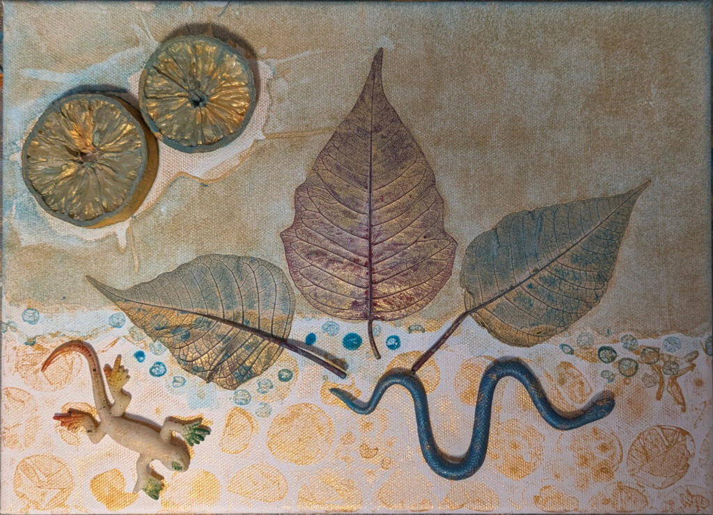 - Objects with depth (lemons, gecko, and snake): These proved challenging for this technique. The space between the object and the cloth made it difficult for the paint to settle in the way I intended. That said, they still left some compelling marks - especially the lemons. I would absolutely consider using them again, but with a different method of paint application. A functioning spray bottle, for example, would have helped.