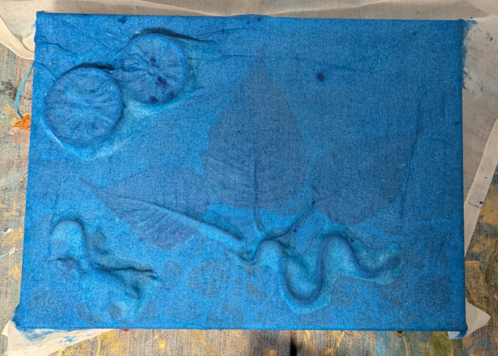 Very little of the light blue made it beneath the smaller bubble wrap, leaving only a few scattered speckles. The spacing of the cloth around the lemons was still a bit too wide and didn't sit as close to the edges as I had hoped. The leaves, however, seemed to be absorbing the paint beautifully, though I wouldn't know what the canvas beneath them would reveal until the final day. I hoped for a subtle but interesting pattern and color.