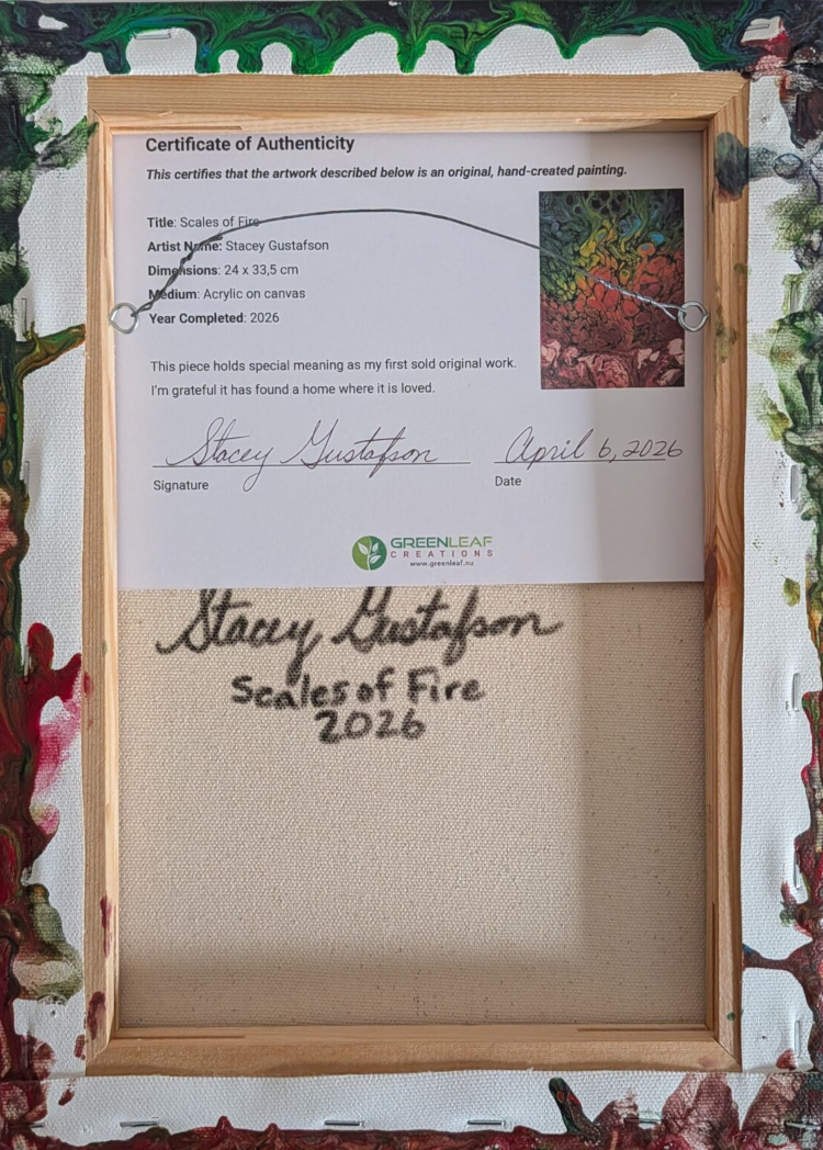 My son Ben named it Scales of Fire. I completed it at the end of September last year, and recently added three coats of varnish so it was finally ready for sale. My friend Tania loved it from the very beginning. It was by far her favorite painting I had done so far, and she always wanted to see it whenever she came over.